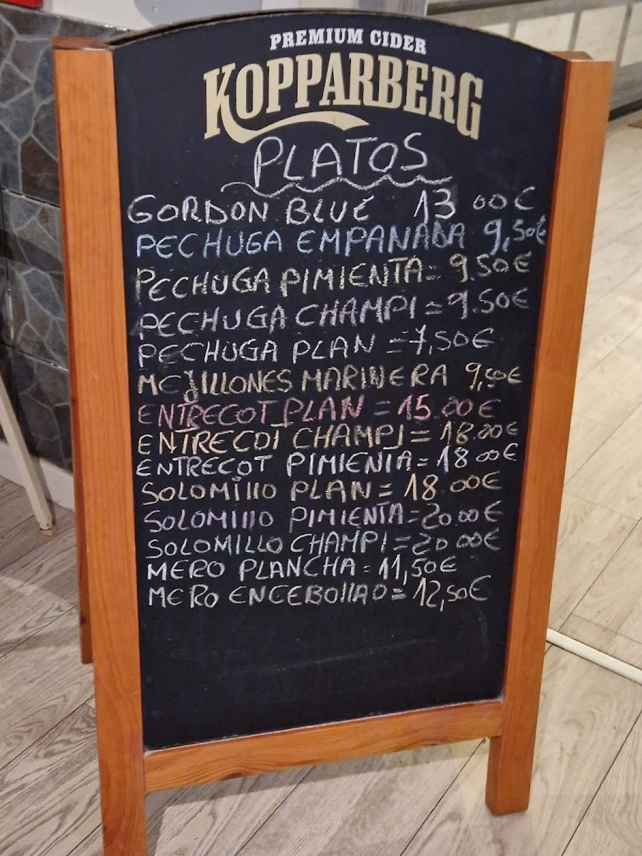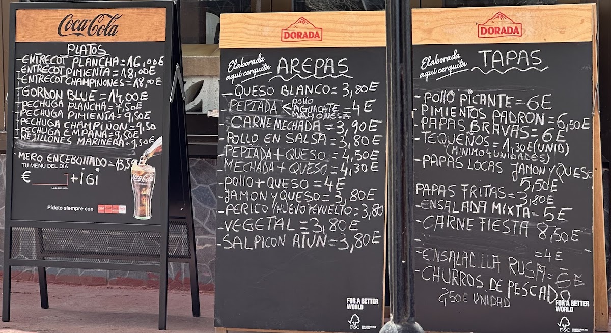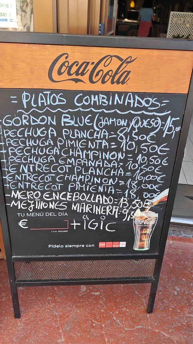 For dessert, options include tiramisu and bizcocho (cake). The drink selection features coffee-based beverages such as cortado leche y leche and barraquito, a layered coffee typical in the Canary Islands.