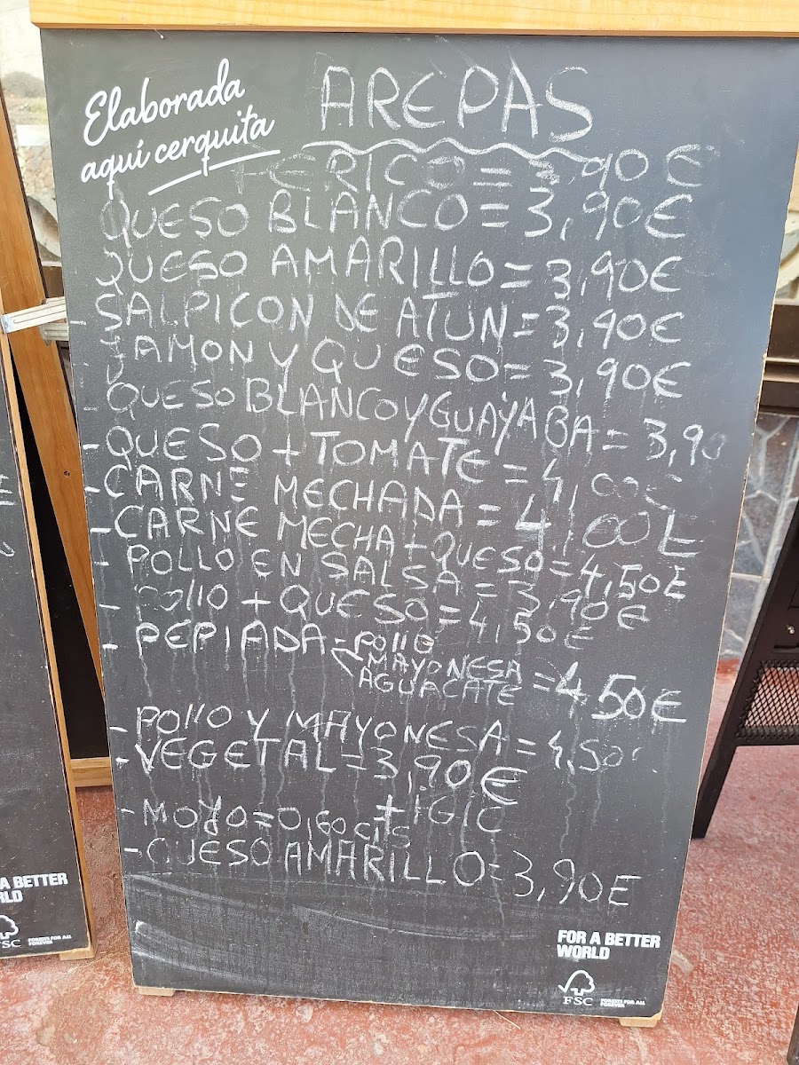 In addition to the main arepa offerings, the menu includes various appetizers and side dishes like queso frito (fried cheese), ensalada mixta (mixed salad), and tapas such as ensaladilla rusa. There are also fish dishes, including baked fish and shellfish with sauce and kabeljau (cod) prepared with onions and peppers, as well as schnitzel served with pepper sauce and fries.